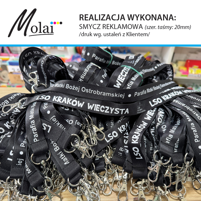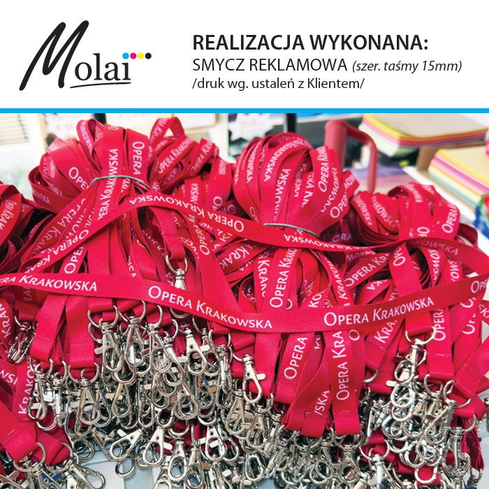 W Agencji Reklamowej Molai zamówisz wiele różnych smyczy, identyfikatorów ... i nie tylko! W Molai możesz wykonać smycz od A do Z z zaprojektowaną według swojego pomysłu dowolną grafiką lub skorzystać z gotowego produktu na którym umieścisz swój indywidualny nadruk. Szeroki wybór Molai zawsze pozwoli wybrać coś odpowiedniego! W ofercie Molai jest wiele produktów, napisz do nas jeśli na stronie nie ma interesującej Cię pozycji. Aby uzyskać informację o kosztach całkowitych wykonania konkretnego zlecenia, należy przesłać numer katalogowy wybranego produktu, nakład i ilość kolorów nadruku (prześlij logo w pliku wektorowym do bezpłatnej wizualizacji i końcowej produkcji). Na terenie lokalu Molai można zakupić smycze i identyfikatory w ilościach detalicznych od 1 sztuki. Jeśli nie jesteś czegoś pewny nie martw się, w Molai podpowiemy i pomożemy kompleksowo wykonać Twoje zlecenie! Zaufało nam wiele firm, instytucji oraz osób prywatnych. Dołącz do nas i ciesz się swoją reklamą!