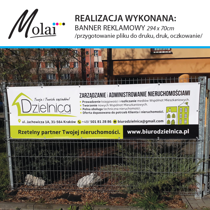 W Agencji Reklamowej Molai zamówisz bannery oczkowane w koło w dowolnym formacie ... i nie tylko! Nasze wydruki i materiał podłoża druku są wysokiej jakości, zapewniamy długą żywotność produktu. W ofercie Molai również roll-upy i inne wydruki wielkoformatowe. Roll up to kasetka do której zwijany jest wydruk. Wydruk w roll-up można wymieniać. Kupując kompletny produkt w Molai usługa wymiany grafiki jest bezpłatna. Zatem przy pierwszym zakupie kosztem jest KASETKA ROLL UP z WYDRUKIEM a później (przy wymianie grafiki) to tylko koszt druku (i ewentualny koszt opracowania grafiki na życzenie). Aby uzyskać informację o kosztach całkowitych wykonania konkretnego zlecenia, należy przesłać rozmiar produktu (cena zależna od rozmiaru w m2). Jeśli nie jesteś czegoś pewny lub nie masz projektu, nie martw się, w Molai podpowiemy i pomożemy Ci kompleksowo wykonać Twoje zlecenie! Zaufało nam wiele firm, instytucji oraz osób prywatnych. Dołącz do nas i ciesz się swoją reklamą!