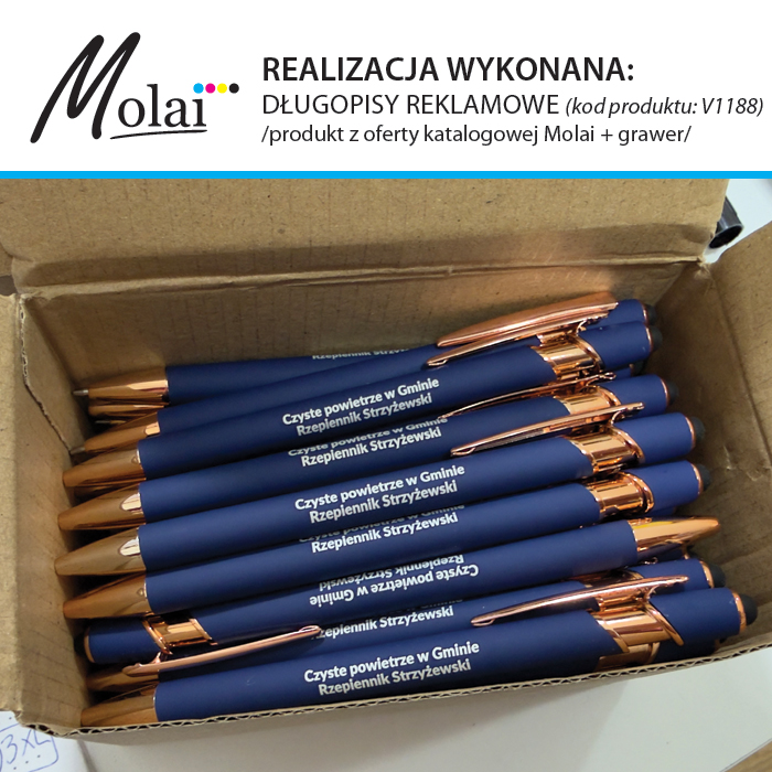 W Agencji Reklamowej Molai zamówisz wiele różnych długopisów ... i nie tylko! Szeroki wybór Molai zawsze pozwoli wybrać coś odpowiedniego. W naszej ofercie jest wiele produktów, napisz do nas jeśli na stronie nie ma interesującej Cię pozycji. Aby uzyskać informację o kosztach całkowitych wykonania konkretnego zlecenia należy przesłać numer katalogowy wybranego produktu, nakład i ilość kolorów nadruku (prześlij logo w pliku wektorowym do bezpłatnej wizualizacji i końcowej produkcji). Na długopisach plastikowych wykonujemy nadruk, na długopisach metalowych poklecamy grawer. Jeśli nie jesteś czegoś pewny nie martw się, w Molai podpowiemy i pomożemy Ci kompleksowo wykonać Twoje zlecenie! Zaufało nam wiele firm, instytucji oraz osób prywatnych. Dołącz do nas i ciesz się swoją reklamą!