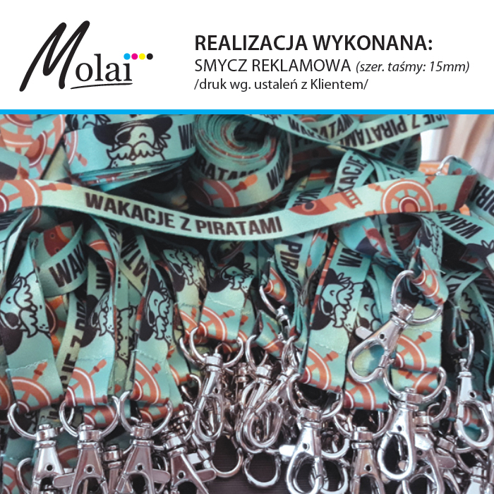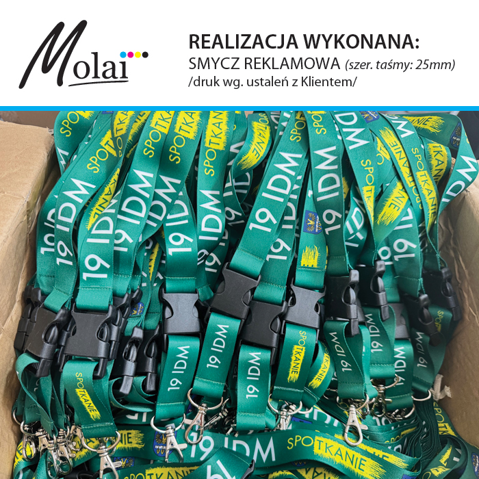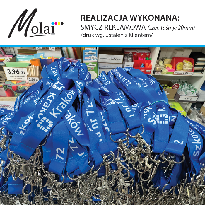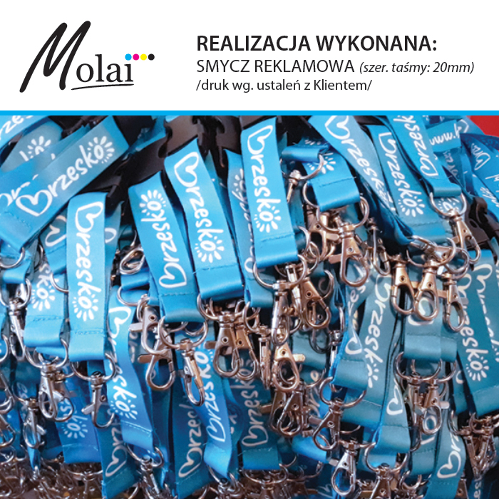W Agencji Reklamowej Molai zamówisz wiele różnych smyczy, identyfikatorów ... i nie tylko! W Molai możesz wykonać smycz od A do Z z zaprojektowaną według swojego pomysłu dowolną grafiką lub skorzystać z gotowego produktu na którym umieścisz swój indywidualny nadruk. Szeroki wybór Molai zawsze pozwoli wybrać coś odpowiedniego! W ofercie Molai jest wiele produktów, napisz do nas jeśli na stronie nie ma interesującej Cię pozycji. Aby uzyskać informację o kosztach całkowitych wykonania konkretnego zlecenia, należy przesłać numer katalogowy wybranego produktu, nakład i ilość kolorów nadruku (prześlij logo w pliku wektorowym do bezpłatnej wizualizacji i końcowej produkcji). Na terenie lokalu Molai można zakupić smycze i identyfikatory w ilościach detalicznych od 1 sztuki. Jeśli nie jesteś czegoś pewny nie martw się, w Molai podpowiemy i pomożemy kompleksowo wykonać Twoje zlecenie! Zaufało nam wiele firm, instytucji oraz osób prywatnych. Dołącz do nas i ciesz się swoją reklamą!