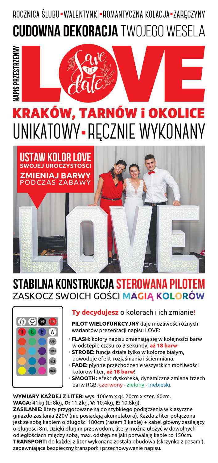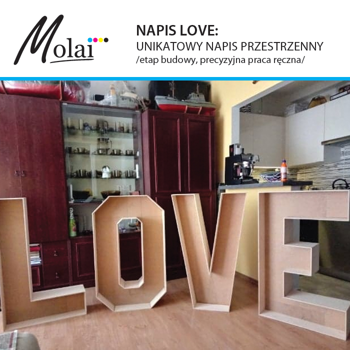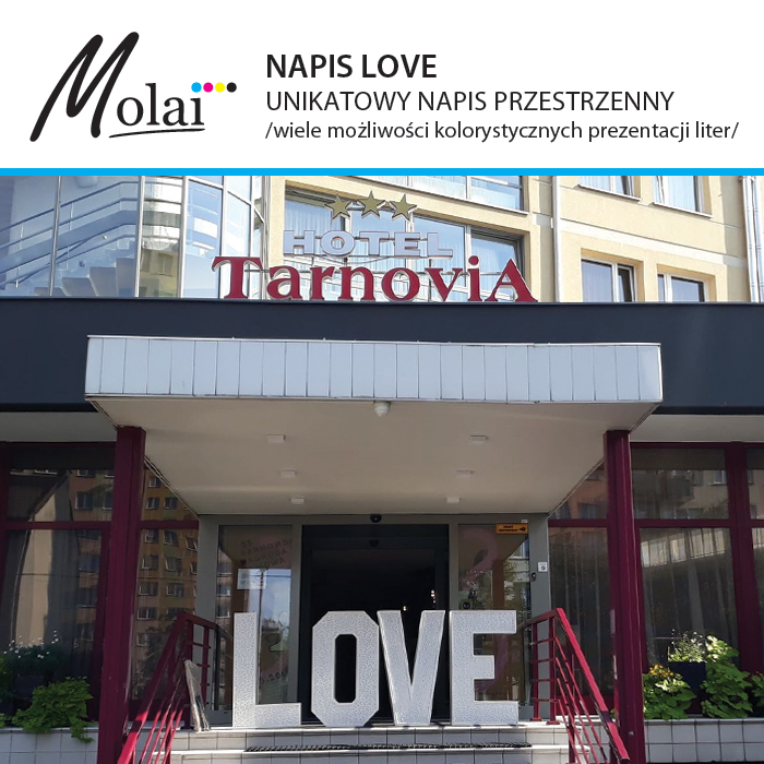 Agencja Reklamowa Molai poleca piękny i unikatowy, w 100% ręcznie wykonany (przez pasjonata modelarza) napis przestrzenny LOVE. Cudowna dekoracja wesel i przyjęć okolicznościowych oraz innych okazji: rocznice ślubu, walentynki, romantyczne kolacje, zaręczyny itp. Doskonały na sesje zdjęciowe, idealny do pamiątkowych zdjęć (np. do kalendarza). Spektakularna dekoracja była inspiracją po targach ślubnych w Paryżu. Napis jest absolutnym unikatem i trendem wyznaczającym kierunki ślubnych standardów światowego poziomu!