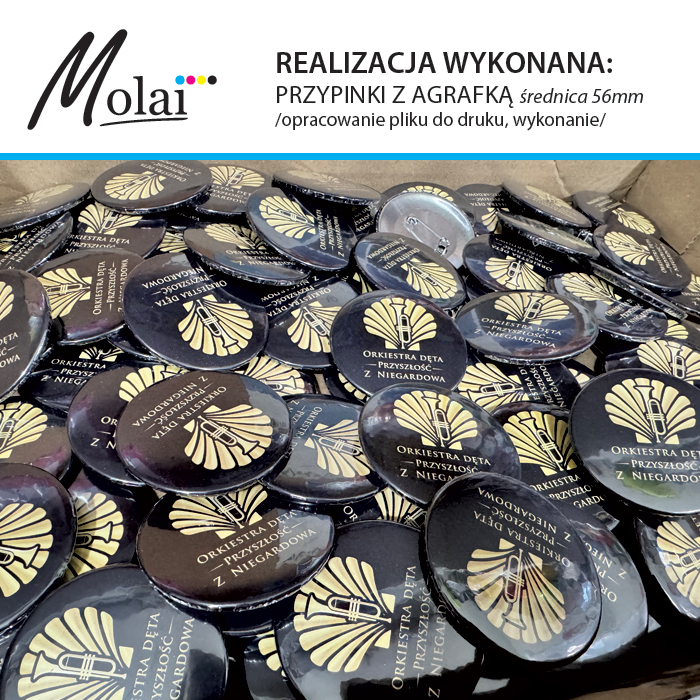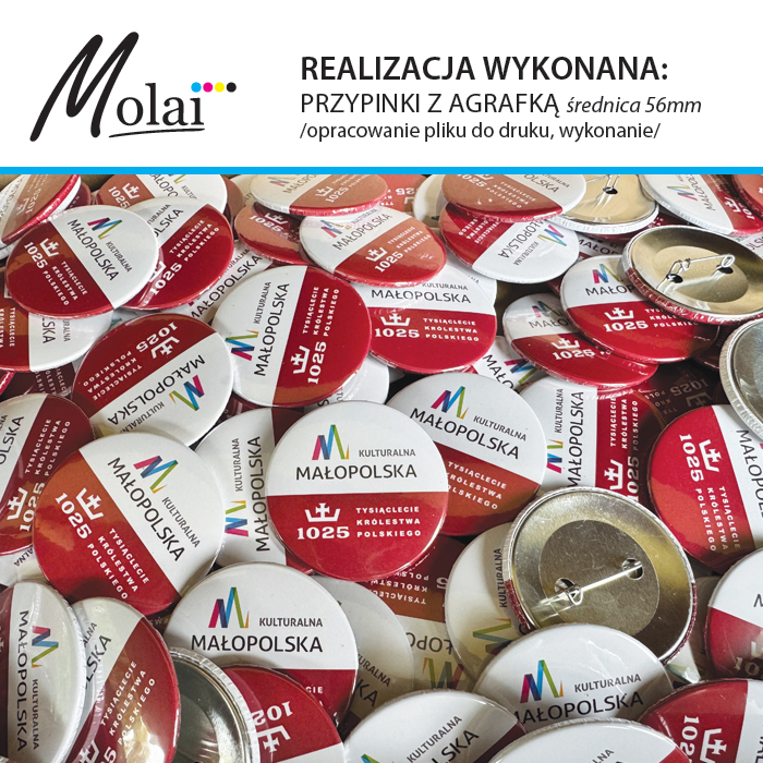 W Agencji Reklamowej Molai zamówisz przypinki z agrafką i magnesy reklamowe z magnesem. Na produkcie może znajdować się dowolna grafika w pełnym kolorze (zdjęcia, logo itp.). Niska cena i mały gabaryt docelowy sprawia, że przypinki są często wybieranym produktem reklamowym. Zapewniają widoczność na imprezach plenerowych i eventach. Doskonałe dla pracowników do firm, sklepów itp. Idealna pamiątka na studniówki, urodziny, jubileusze, spotkania klasowe itp. Znakomita promocja miast, gmin i programów unijnych. Jeśli nie jesteś czegoś pewny nie martw się, w Molai podpowiemy i pomożemy kompleksowo wykonać Twoje zlecenie! Zaufało nam wiele firm, instytucji oraz osób prywatnych. Dołącz do nas i ciesz się swoją reklamą! Minimalne zamówienie 10 sztuk (w obrębie zamówienia może być mix grafik).